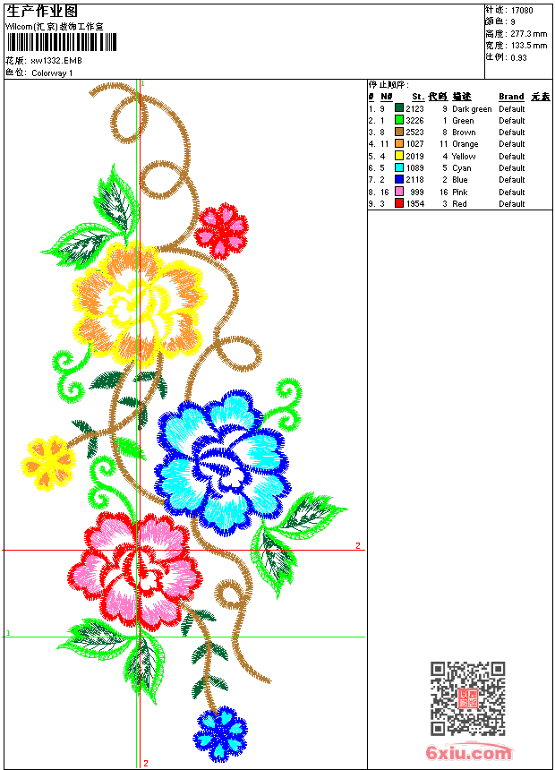 - emb花版参数: 大小:149.00 KB / 尺寸:133*277[毫米] / 针数:17080针 / 线色:9 / 格式:emb / 版本:9