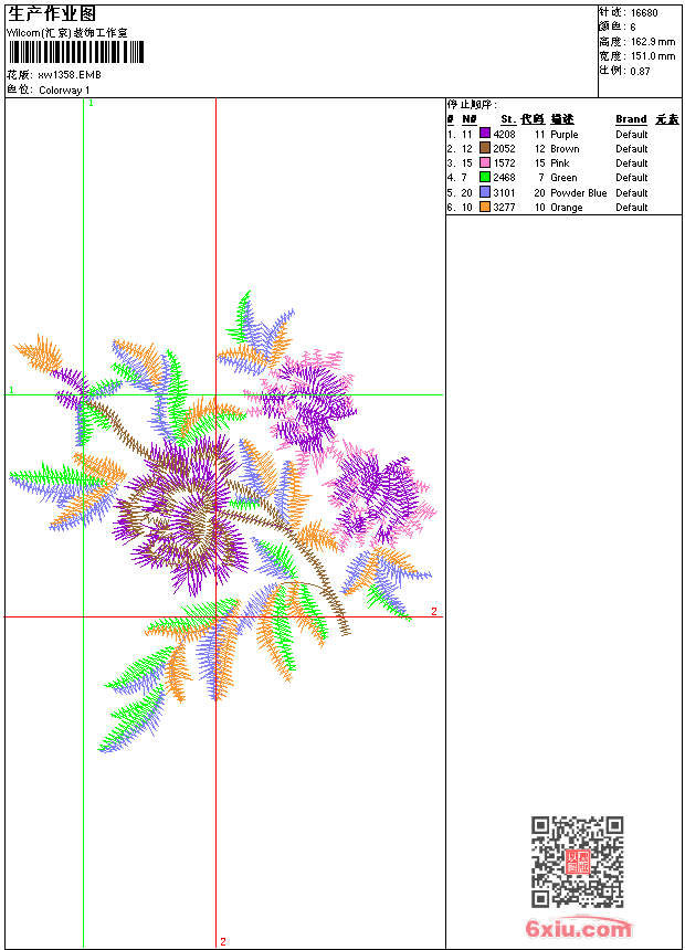 - emb花版参数: 大小:69.00 KB / 尺寸:151*163[毫米] / 针数:16680针 / 线色:6 / 格式:emb / 版本:9