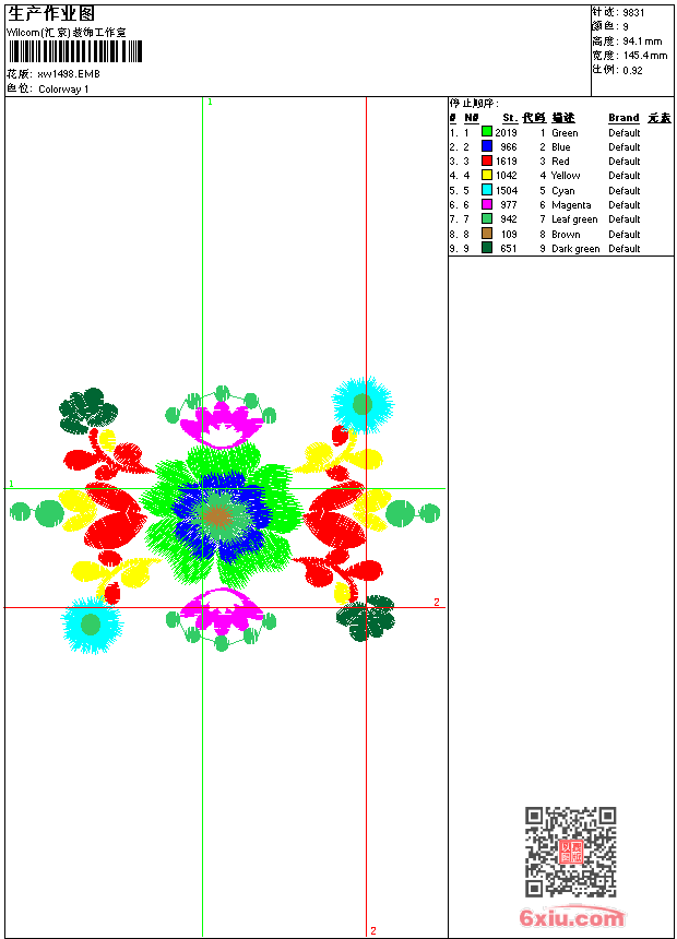 - emb花版参数: 大小:59.50 KB / 尺寸:145*94[毫米] / 针数:9831针 / 线色:9 / 格式:emb / 版本:9