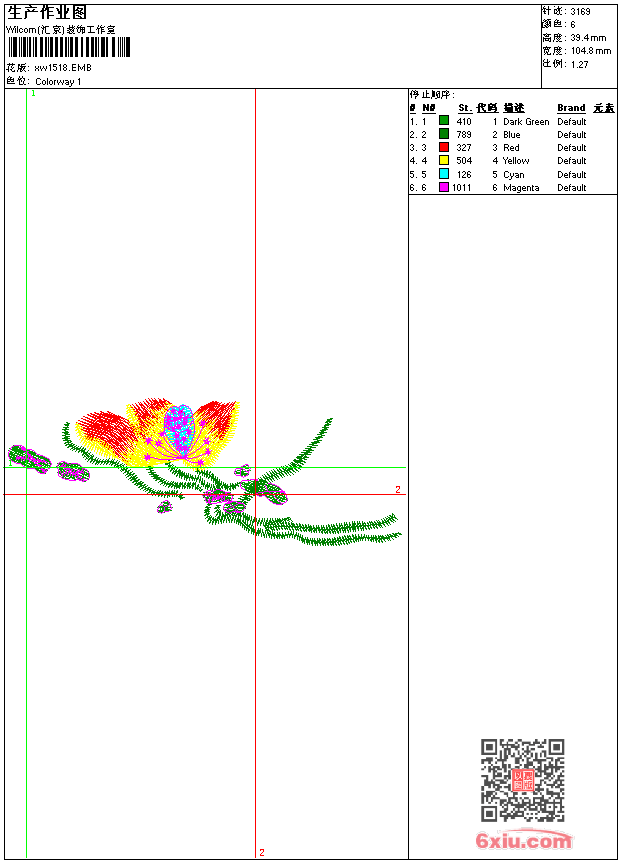 - emb花版参数: 大小:40.00 KB / 尺寸:105*39[毫米] / 针数:3169针 / 线色:6 / 格式:emb / 版本:9