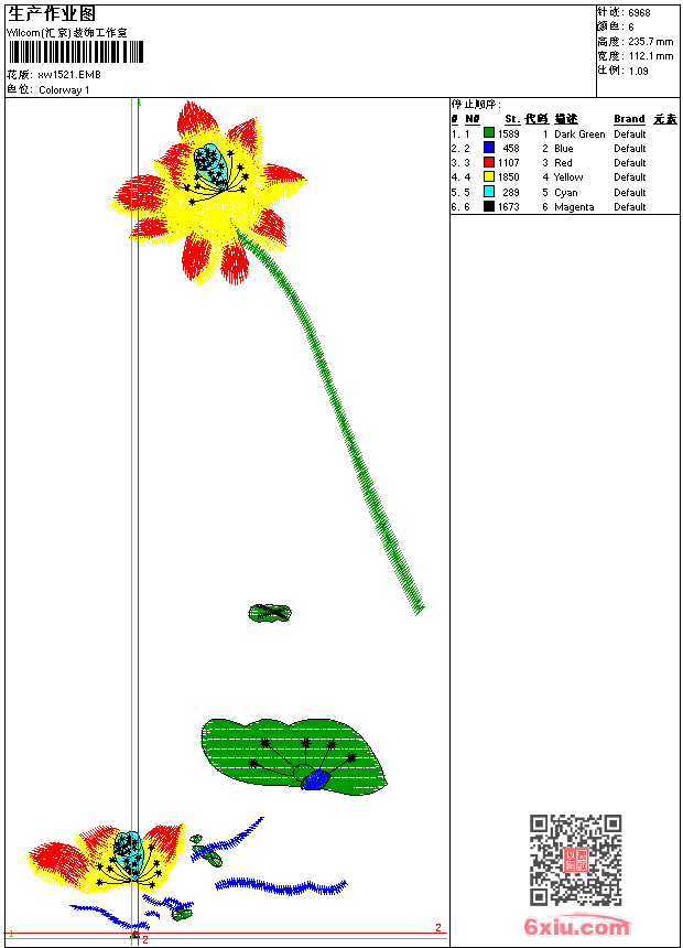 - emb花版参数: 大小:58.00 KB / 尺寸:112*236[毫米] / 针数:6968针 / 线色:6 / 格式:emb / 版本:9