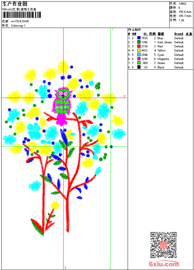 - emb花版参数: 大小:106.50 KB / 尺寸:106*151[毫米] / 针数:14902针 / 线色:8 / 格式:emb / 版本:9