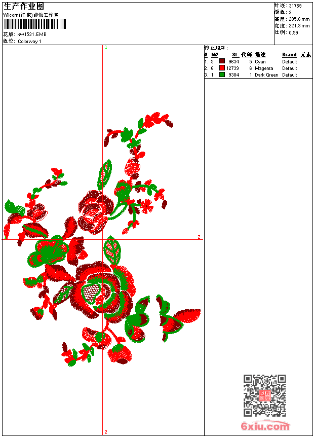 - emb花版参数: 大小:227.00 KB / 尺寸:221*286[毫米] / 针数:31759针 / 线色:3 / 格式:emb / 版本:9