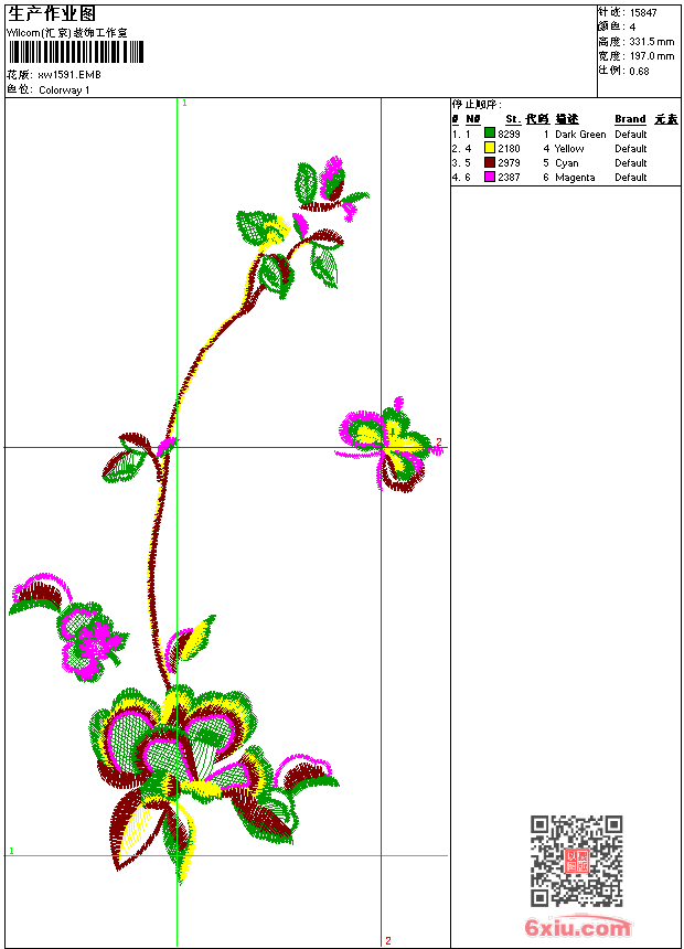 - emb花版参数: 大小:109.50 KB / 尺寸:197*331[毫米] / 针数:15847针 / 线色:4 / 格式:emb / 版本:9