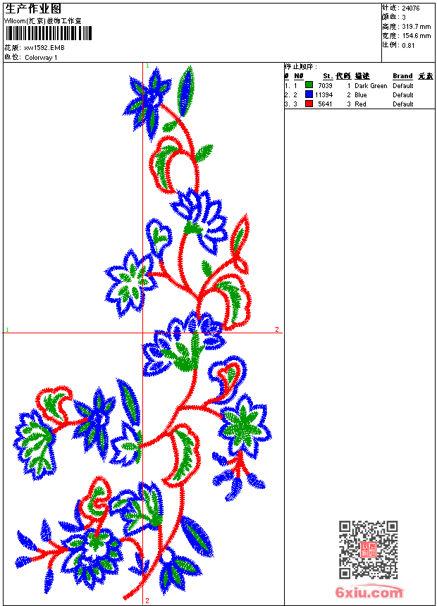 - emb花版参数: 大小:169.00 KB / 尺寸:155*320[毫米] / 针数:24076针 / 线色:3 / 格式:emb / 版本:9