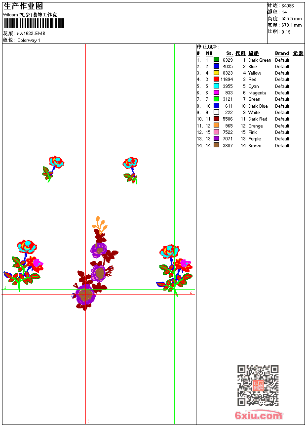 - emb花版参数: 大小:373.00 KB / 尺寸:679*556[毫米] / 针数:64096针 / 线色:14 / 格式:emb / 版本:9