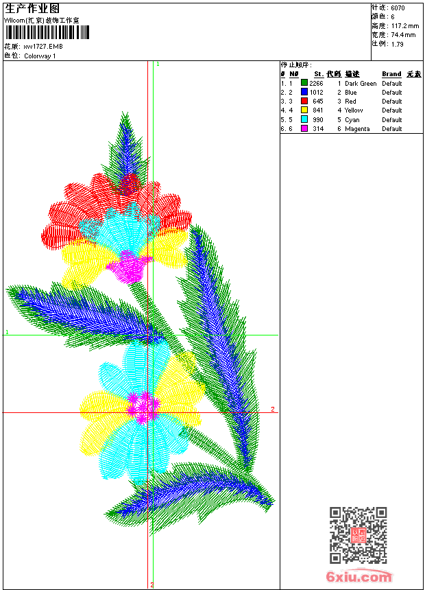 - emb花版参数: 大小:44.50 KB / 尺寸:74*117[毫米] / 针数:6070针 / 线色:6 / 格式:emb / 版本:9