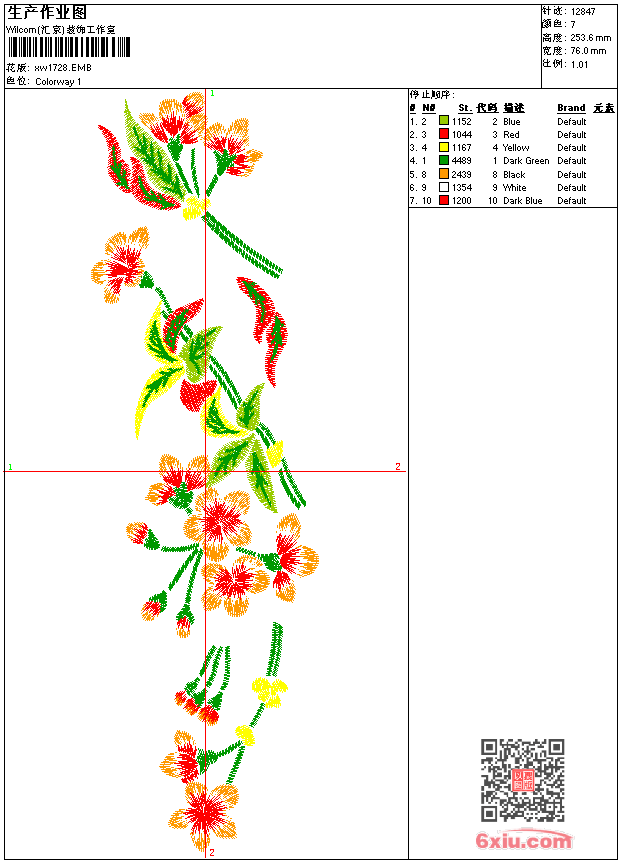 - emb花版参数: 大小:94.50 KB / 尺寸:76*254[毫米] / 针数:12847针 / 线色:7 / 格式:emb / 版本:9