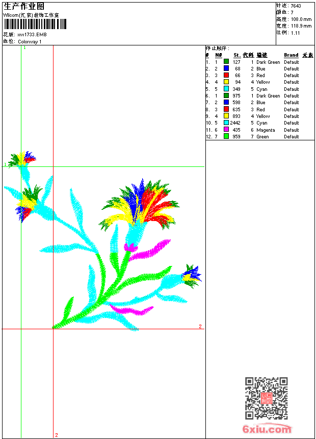 - emb花版参数: 大小:63.50 KB / 尺寸:119*108[毫米] / 针数:7643针 / 线色:7 / 格式:emb / 版本:9