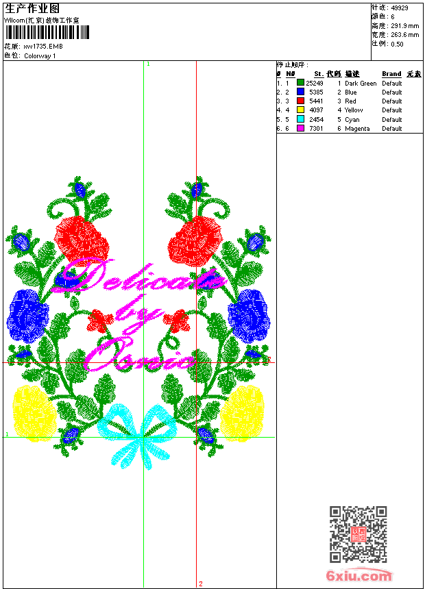 - emb花版参数: 大小:155.00 KB / 尺寸:264*292[毫米] / 针数:49929针 / 线色:6 / 格式:emb / 版本:9