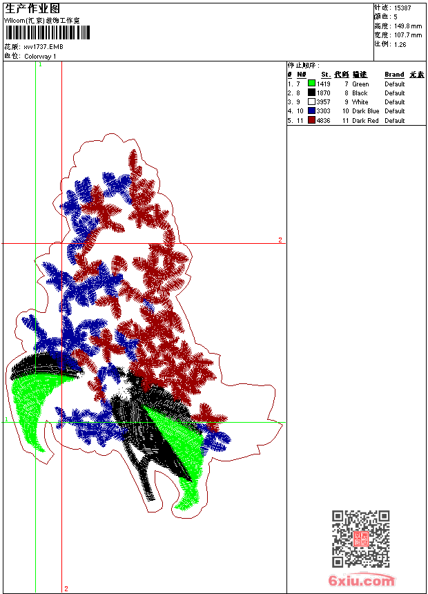 - emb花版参数: 大小:108.00 KB / 尺寸:108*150[毫米] / 针数:15387针 / 线色:5 / 格式:emb / 版本:9