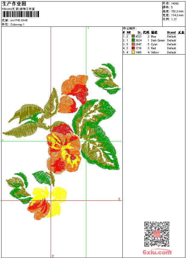 - emb花版参数: 大小:93.50 KB / 尺寸:114*152[毫米] / 针数:14392针 / 线色:5 / 格式:emb / 版本:9