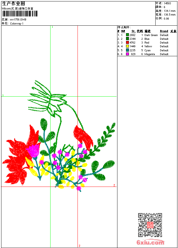 - emb花版参数: 大小:108.50 KB / 尺寸:137*134[毫米] / 针数:14503针 / 线色:6 / 格式:emb / 版本:9