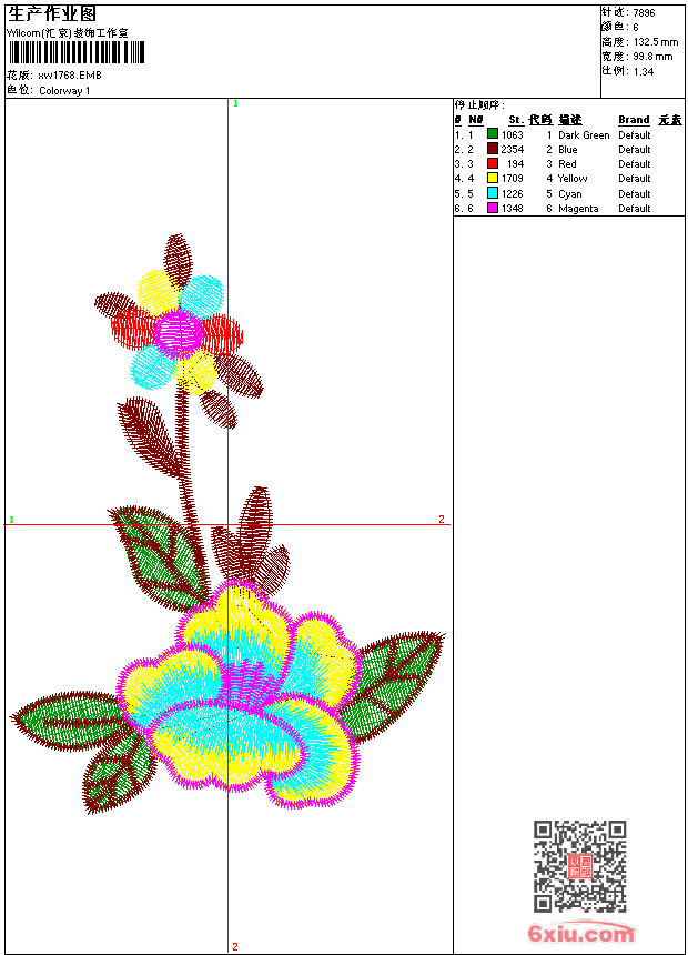 - emb花版参数: 大小:65.50 KB / 尺寸:100*133[毫米] / 针数:7896针 / 线色:6 / 格式:emb / 版本:9
