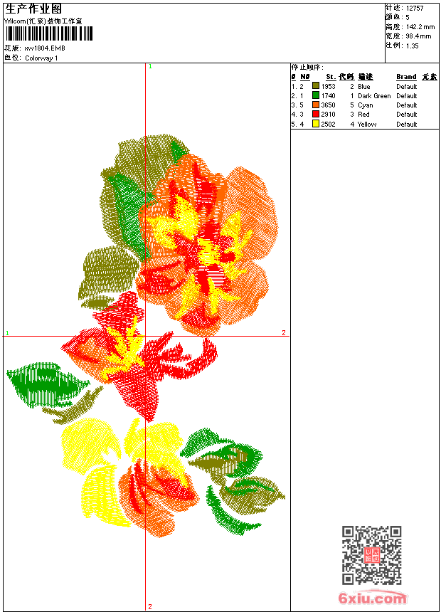 - emb花版参数: 大小:77.50 KB / 尺寸:98*142[毫米] / 针数:12757针 / 线色:5 / 格式:emb / 版本:9