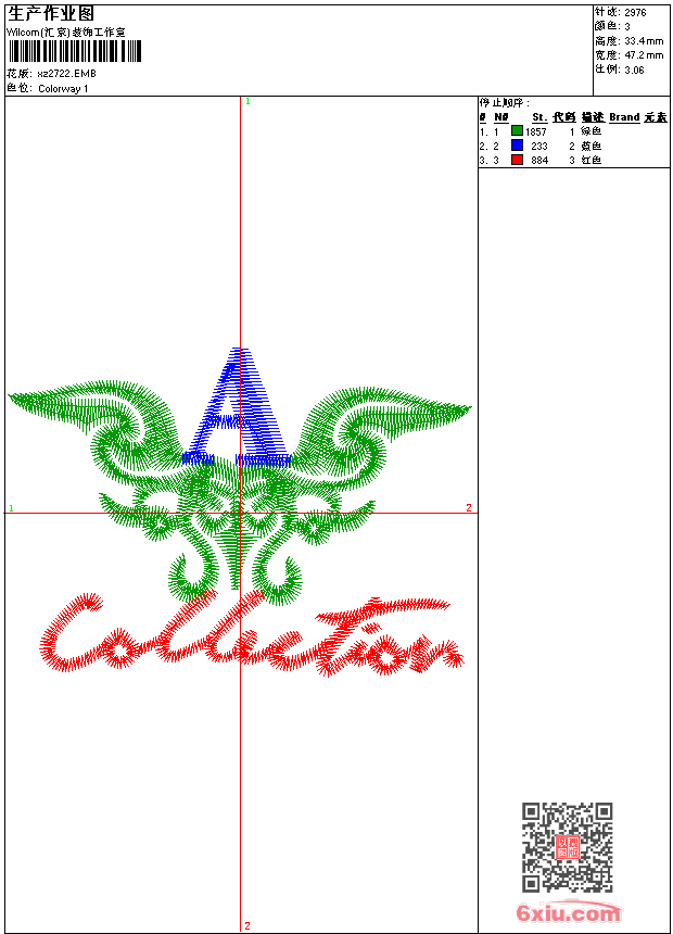 - emb花版参数: 大小:35.00 KB / 尺寸:47*33[毫米] / 针数:2976针 / 线色:3 / 格式:emb / 版本:9