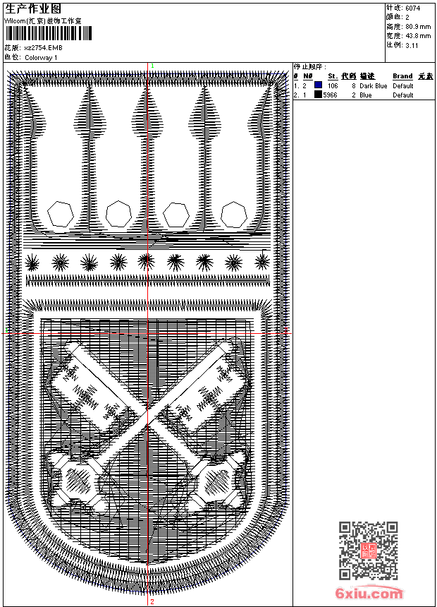 - emb花版参数: 大小:37.00 KB / 尺寸:44*81[毫米] / 针数:6074针 / 线色:2 / 格式:emb / 版本:9