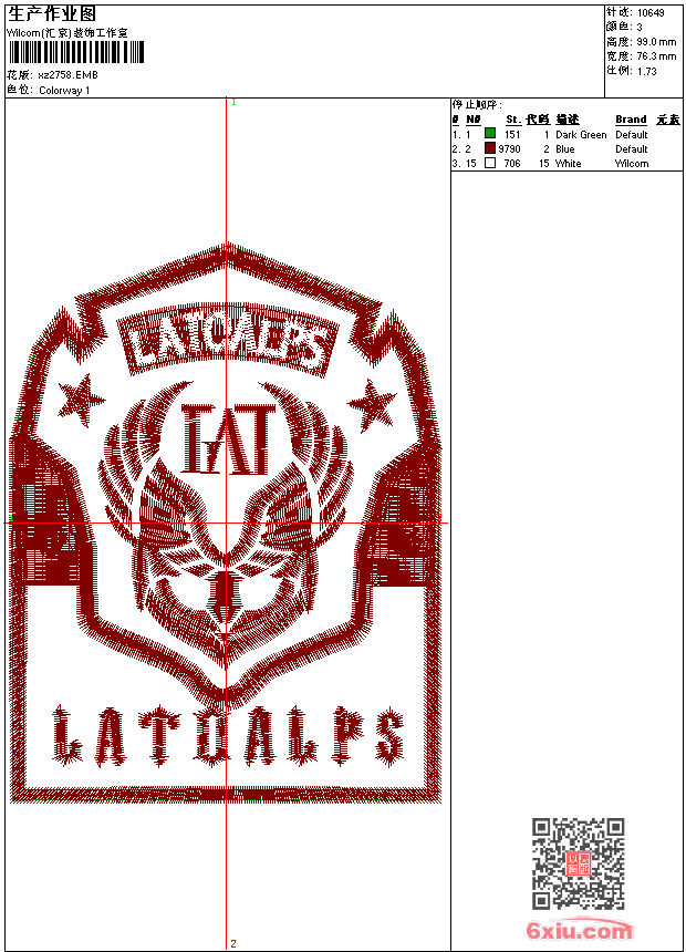 - emb花版参数: 大小:56.00 KB / 尺寸:76*99[毫米] / 针数:10649针 / 线色:3 / 格式:emb / 版本:9