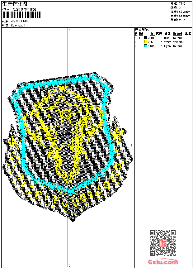 - emb花版参数: 大小:43.50 KB / 尺寸:55*63[毫米] / 针数:7780针 / 线色:3 / 格式:emb / 版本:9