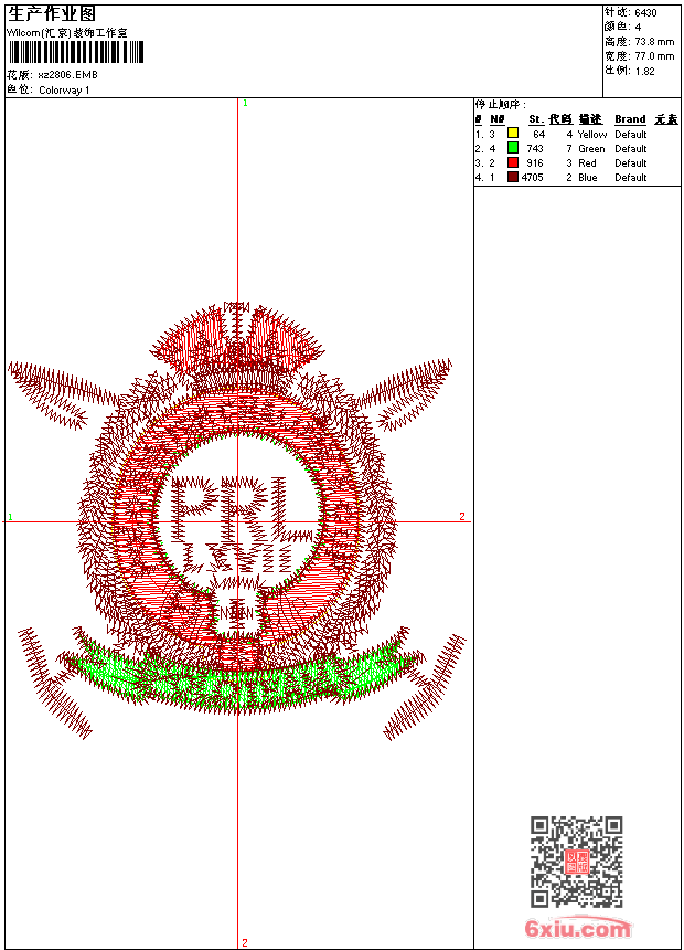 - emb花版参数: 大小:76.00 KB / 尺寸:77*74[毫米] / 针数:6430针 / 线色:4 / 格式:emb / 版本:9