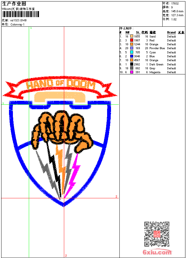 - emb花版参数: 大小:87.00 KB / 尺寸:127*145[毫米] / 针数:17832针 / 线色:9 / 格式:emb / 版本:9