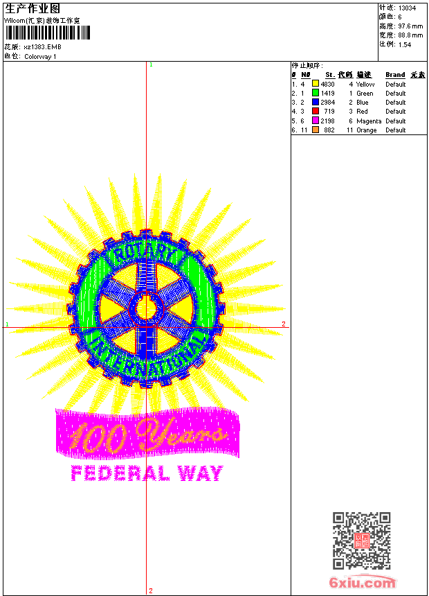 - emb花版参数: 大小:72.50 KB / 尺寸:89*98[毫米] / 针数:13034针 / 线色:6 / 格式:emb / 版本:9