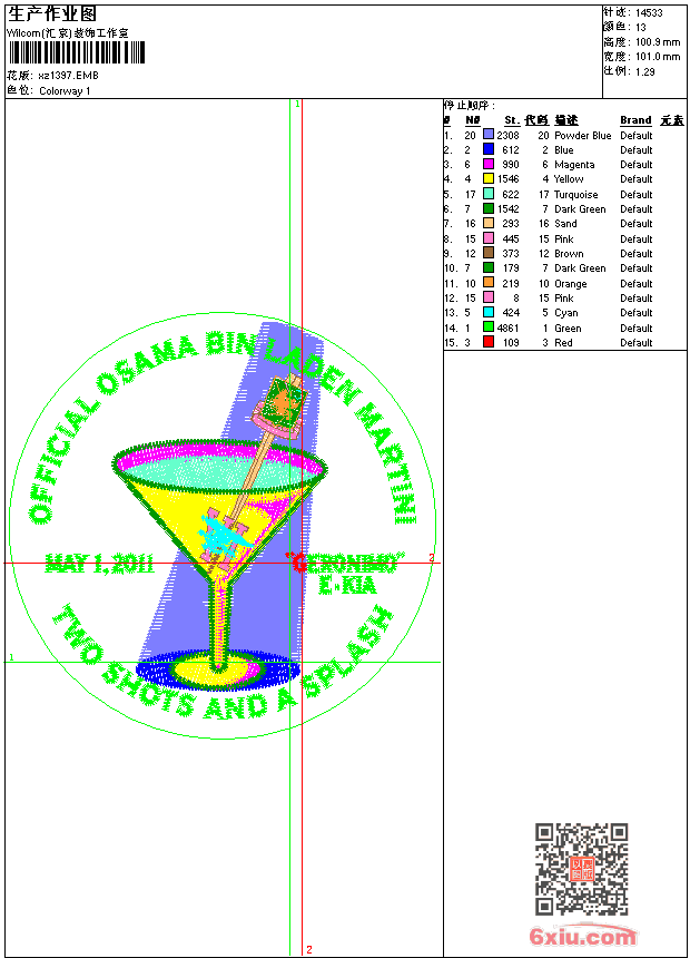 - emb花版参数: 大小:99.50 KB / 尺寸:101*101[毫米] / 针数:14533针 / 线色:13 / 格式:emb / 版本:9