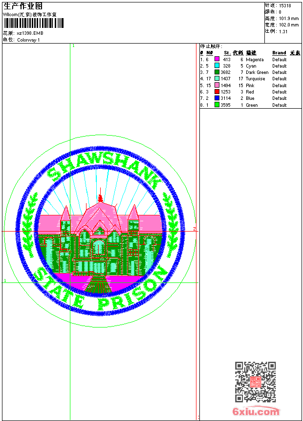 - emb花版参数: 大小:88.00 KB / 尺寸:102*102[毫米] / 针数:15318针 / 线色:8 / 格式:emb / 版本:9