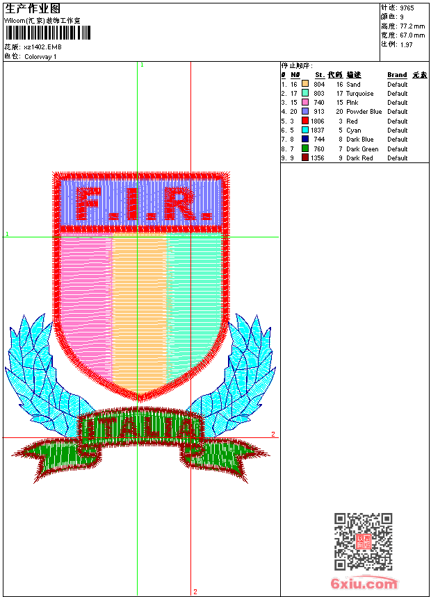 - emb花版参数: 大小:58.00 KB / 尺寸:67*77[毫米] / 针数:9765针 / 线色:9 / 格式:emb / 版本:9