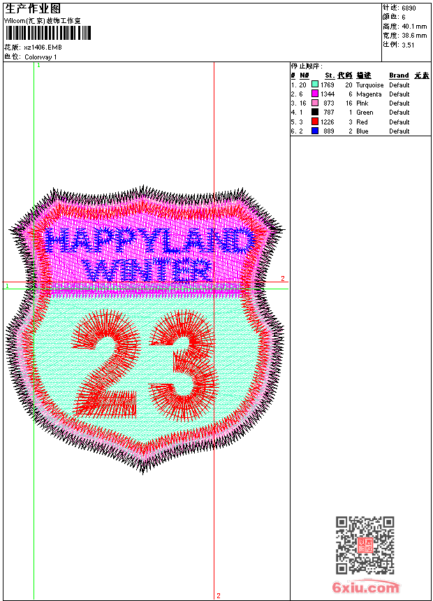 - emb花版参数: 大小:49.00 KB / 尺寸:39*40[毫米] / 针数:6890针 / 线色:6 / 格式:emb / 版本:9