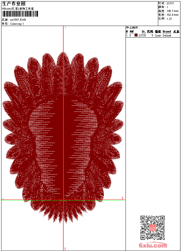 - emb花版参数: 大小:71.00 KB / 尺寸:103*146[毫米] / 针数:23737针 / 线色:1 / 格式:emb / 版本:9