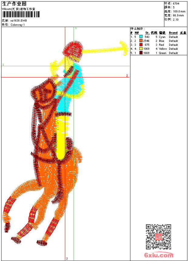 - emb花版参数: 大小:50.00 KB / 尺寸:67*109[毫米] / 针数:6704针 / 线色:5 / 格式:emb / 版本:9
