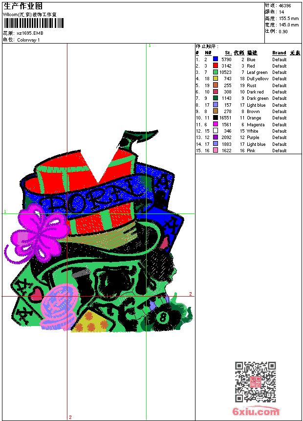 - emb花版参数: 大小:219.50 KB / 尺寸:145*156[毫米] / 针数:46396针 / 线色:14 / 格式:emb / 版本:9