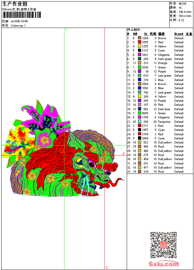 - emb花版参数: 大小:332.00 KB / 尺寸:184*147[毫米] / 针数:46338针 / 线色:16 / 格式:emb / 版本:9