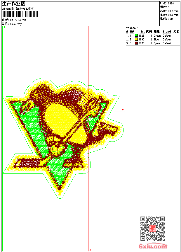 - emb花版参数: 大小:55.50 KB / 尺寸:61*60[毫米] / 针数:9496针 / 线色:3 / 格式:emb / 版本:9