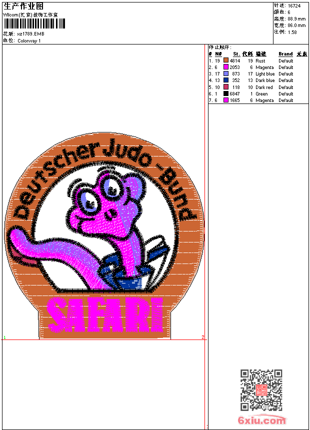 - emb花版参数: 大小:90.50 KB / 尺寸:86*89[毫米] / 针数:16724针 / 线色:6 / 格式:emb / 版本:9