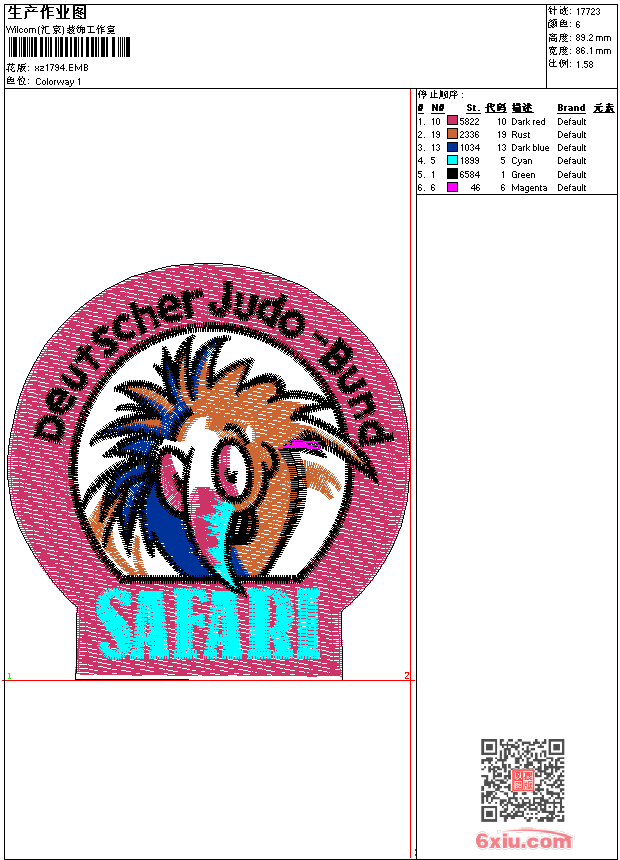 - emb花版参数: 大小:93.00 KB / 尺寸:86*89[毫米] / 针数:17723针 / 线色:6 / 格式:emb / 版本:9