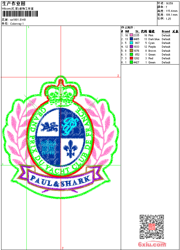 - emb花版参数: 大小:124.50 KB / 尺寸:109*115[毫米] / 针数:16359针 / 线色:7 / 格式:emb / 版本:9