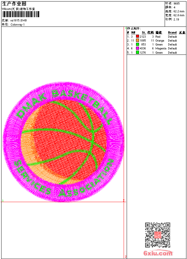 - emb花版参数: 大小:69.50 KB / 尺寸:63*62[毫米] / 针数:9685针 / 线色:4 / 格式:emb / 版本:9