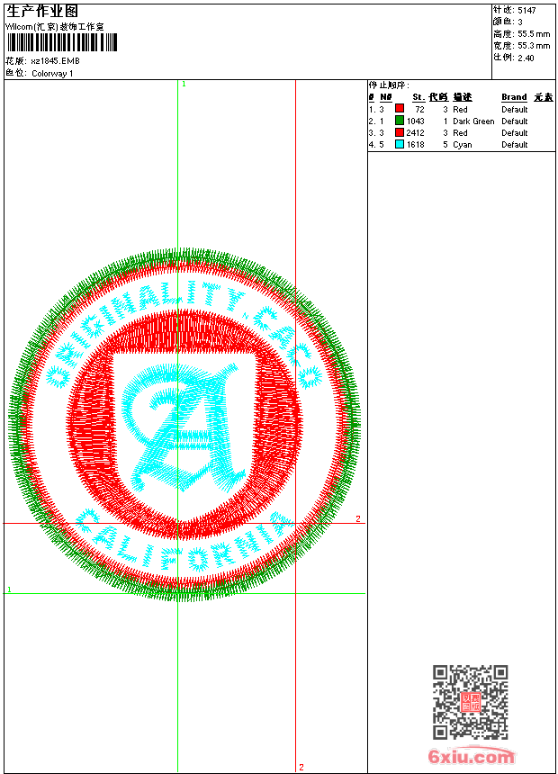 - emb花版参数: 大小:44.00 KB / 尺寸:55*55[毫米] / 针数:5147针 / 线色:3 / 格式:emb / 版本:9