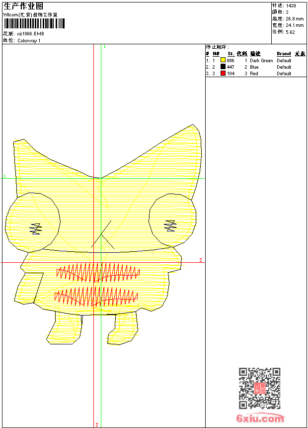 - emb花版参数: 大小:21.00 KB / 尺寸:24*27[毫米] / 针数:1439针 / 线色:3 / 格式:emb / 版本:9