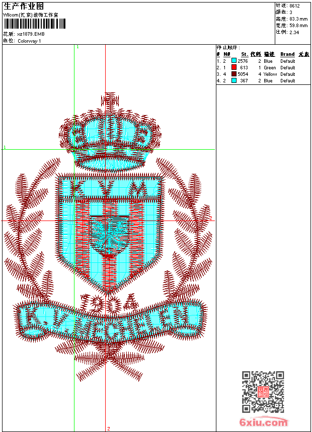- emb花版参数: 大小:69.00 KB / 尺寸:60*83[毫米] / 针数:8612针 / 线色:3 / 格式:emb / 版本:9