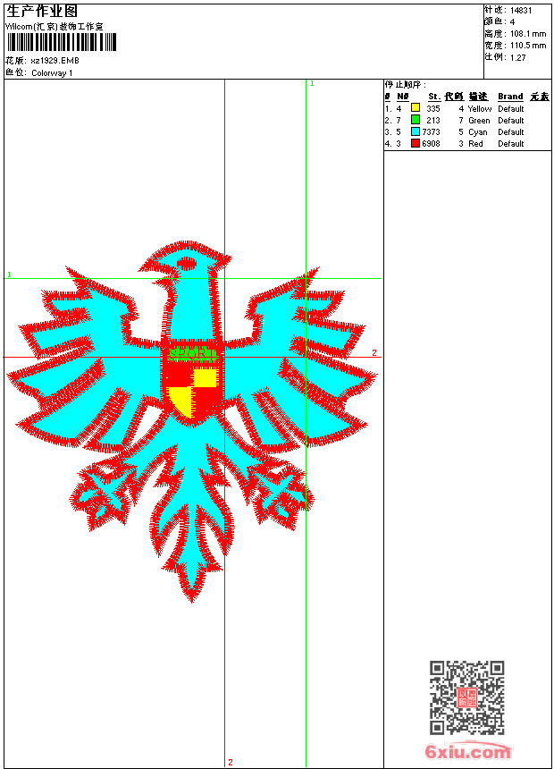 - emb花版参数: 大小:65.50 KB / 尺寸:111*108[毫米] / 针数:14831针 / 线色:4 / 格式:emb / 版本:9