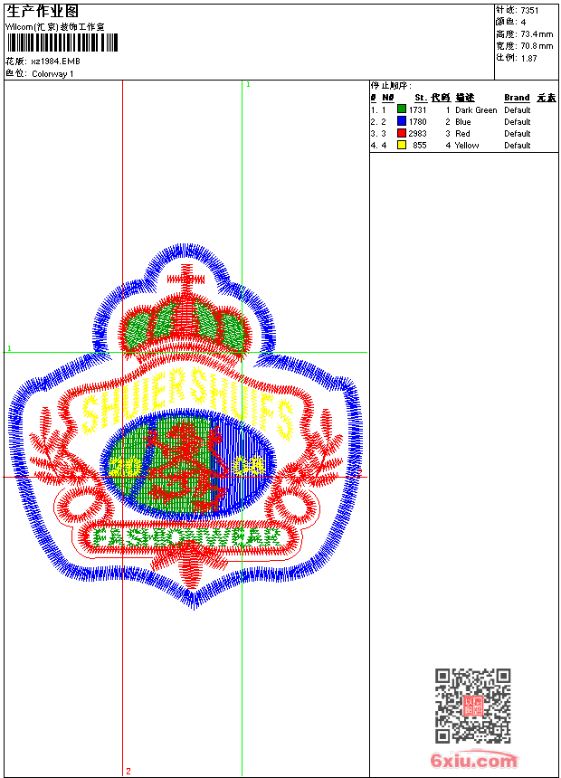 - emb花版参数: 大小:64.50 KB / 尺寸:71*73[毫米] / 针数:7351针 / 线色:4 / 格式:emb / 版本:9