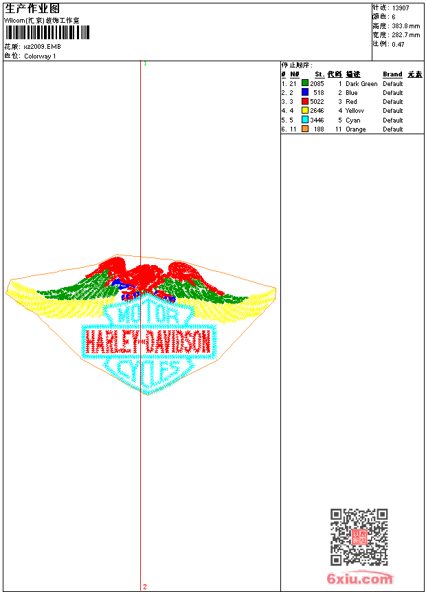 - emb花版参数: 大小:80.00 KB / 尺寸:283*384[毫米] / 针数:13907针 / 线色:6 / 格式:emb / 版本:9