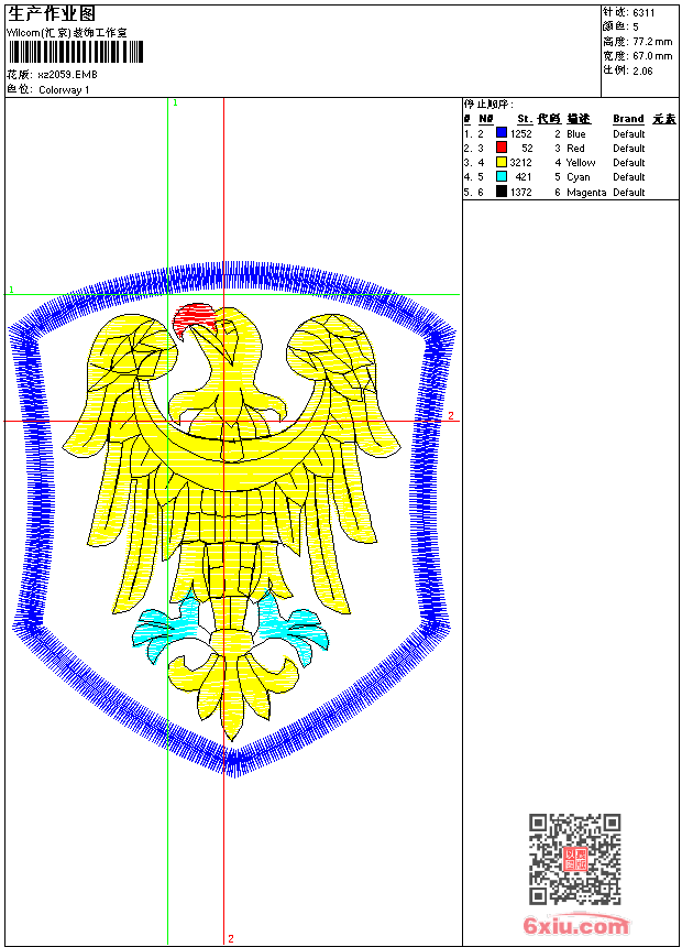 - emb花版参数: 大小:38.50 KB / 尺寸:67*77[毫米] / 针数:6311针 / 线色:5 / 格式:emb / 版本:9