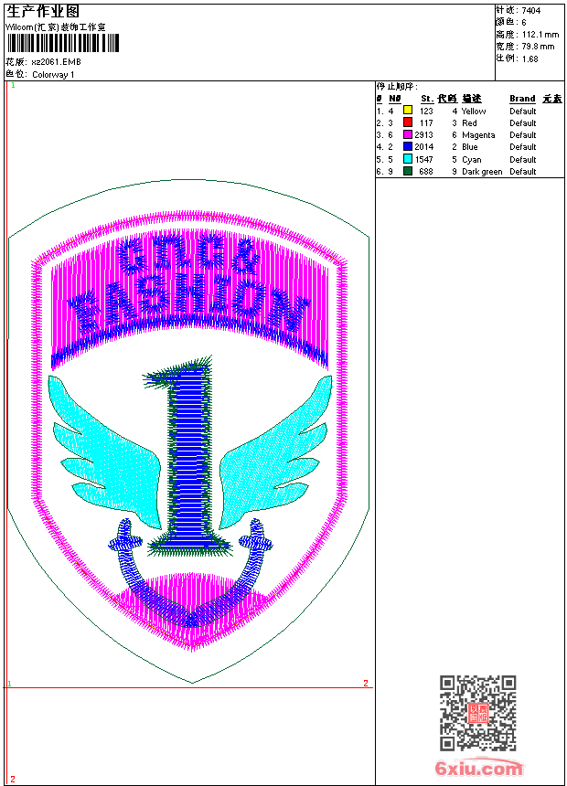 - emb花版参数: 大小:45.50 KB / 尺寸:80*112[毫米] / 针数:7404针 / 线色:6 / 格式:emb / 版本:9