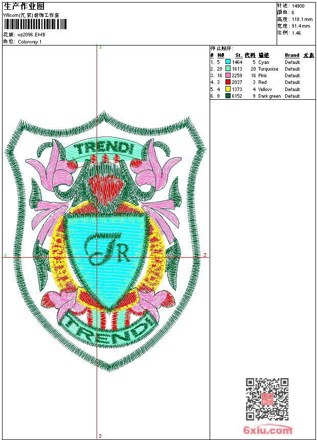- emb花版参数: 大小:100.50 KB / 尺寸:91*118[毫米] / 针数:14900针 / 线色:6 / 格式:emb / 版本:9