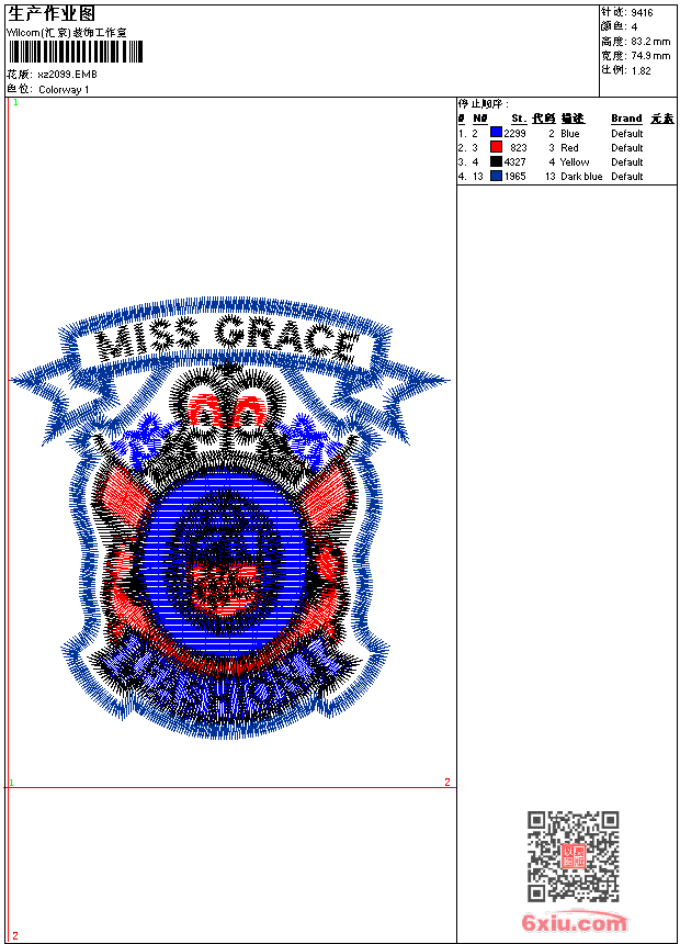- emb花版参数: 大小:68.50 KB / 尺寸:75*83[毫米] / 针数:9416针 / 线色:4 / 格式:emb / 版本:9
