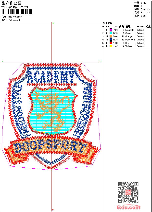 - emb花版参数: 大小:71.00 KB / 尺寸:68*74[毫米] / 针数:9749针 / 线色:6 / 格式:emb / 版本:9